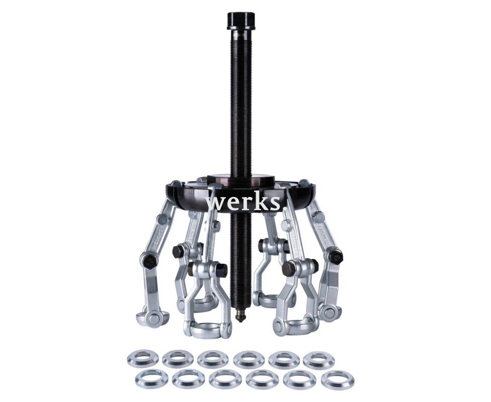 Съёмник ступиц с поперечной балкой предназначен для демонтажа ступиц грузовых автомобилей. На поперечной балке можно закрепить до шести съёмных захватов в различных положениях. Захваты также можно отрегулировать на две разные длины. Это делает съёмник универсальным даже для болтов с различным диаметром окружности. Защита колёсных болтов благодаря плоской посадке гаек. Регулируемые по длине и индивидуально позиционируемые съёмные захваты, а также частичные диски разных размеров гарантируют универсальность применения на коммерческих автомобилях.