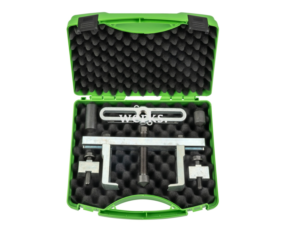 Набор для снятия шкивов всех типов автомобилей предназначен для снятия многоручьевых шкивов диаметром до 195 мм в автомобильной промышленности. Двухзахватная конструкция обеспечивает компактность работы и возможность работы в любом положении и даже при полной нагрузке благодаря параллельно расположенным захватам. Универсально подходит для большинства типов автомобилей. Выступ на головке шпинделя предотвращает соскальзывание ключа.
