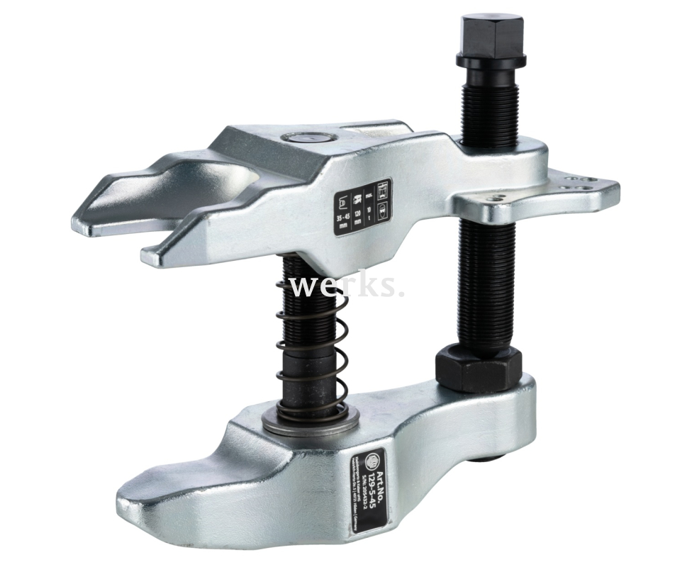 Съемник рулевой тяги и шарниров рулевой тяги для тяжелых грузовиков серии 129 используется для механического извлечения шаровых пальцев при снятии шаровых опор рулевых тяг. Серия 129 впечатляет своей универсальностью применения. В серии представлены съемники шаровых опор различных размеров с различными раскрытиями губок. Диапазон натяжения рычага регулируется с помощью резьбы центрального шпинделя. Сверхпрочная конструкция основного корпуса и усиленная вилка особенно подходят для тяжелых коммерческих автомобилей и низкопольных автобусов. Благодаря центральному шпинделю съемник можно регулировать и предварительно натягивать.