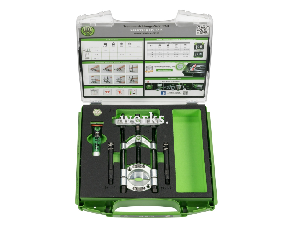 Комплект из 4-х съёмников 17-K используется для демонтажа шарикоподшипников, роликоподшипников, внутренних колец и других плоских деталей в ремесленном производстве, промышленности и мастерских, где недостаточно места для захватов. Процесс демонтажа позволяет сначала аккуратно отделить эти детали, прежде чем их можно будет извлечь. По сравнению с серией 15, серия 17 особенно удобна, поскольку захваты быстро и централизованно натягиваются прижимным шпинделем. Этот комплект из 4-х съёмников включает в себя по одному съёмнику и устройству для демонтажа, а также пару удлинителей, что обеспечивает полный спектр применения. Универсальная сборка, ориентированная на конкретную область применения. Хранение в коробке позволяет легко контролировать комплектацию набора.