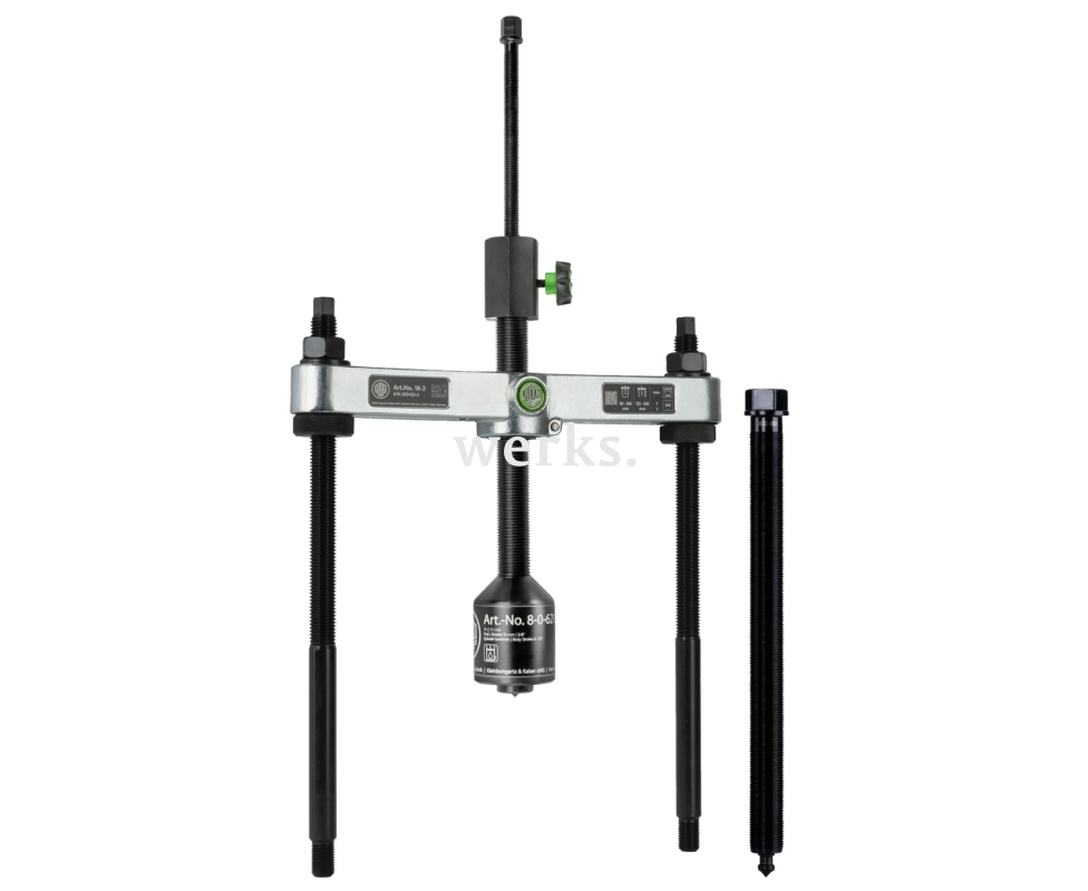 Съёмники серии 18 используются совместно с сепараторами серий 15 и 17 для наружного извлечения плоскостных или тонкостенных деталей в ремесленном производстве, промышленности и мастерских, когда места для захватов недостаточно. Процесс разделения-извлечения позволяет бережно отделить эти детали перед их последующим извлечением. Серия 18-B дополнительно оснащена гидравлическим шпинделем, развивающим среднее усилие натяжения до 20 тонн, что обеспечивает эффективное и экономичное разделение-извлечение. Закрепление разделительного и съёмного устройств обеспечивает максимальную устойчивость при вытягивании. Если ввернуть захваты в зажимное устройство наоборот, площадь соприкосновения увеличится, и извлечение будет более плавным.