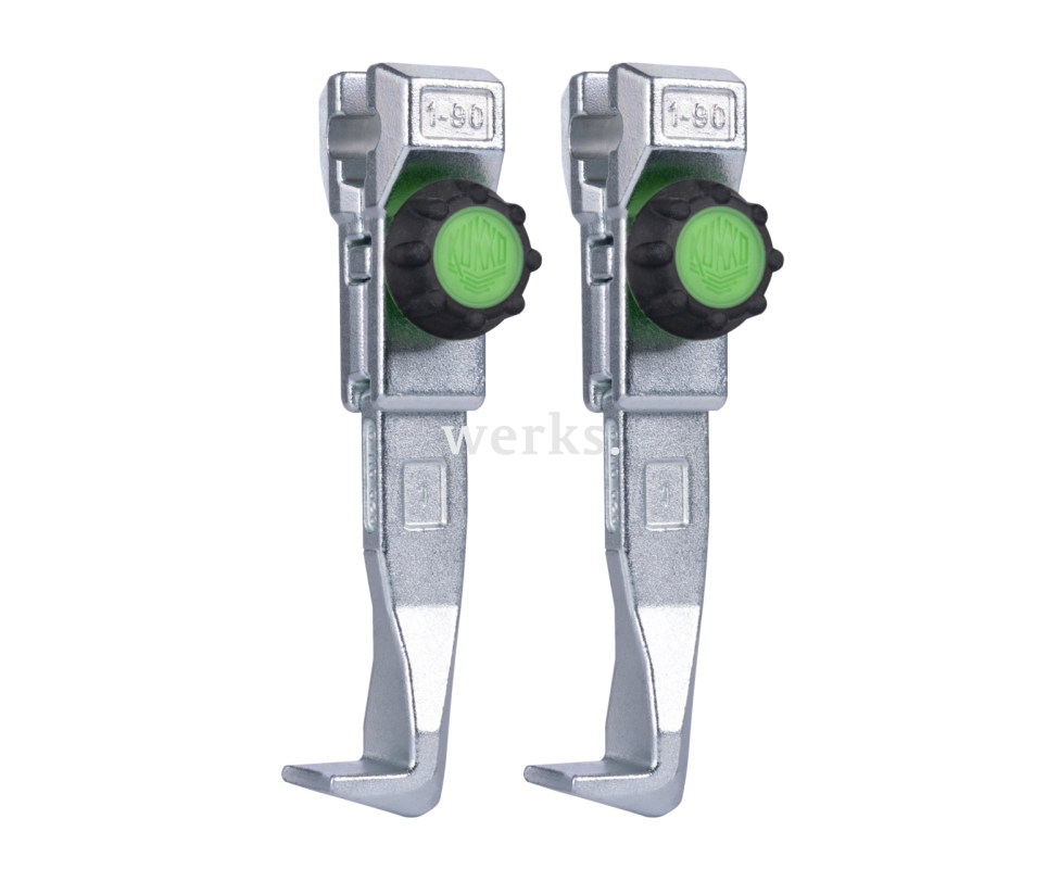 Пара из двух быстрорегулируемых стандартных съёмных захватов подходит для универсальных двухлапковых съёмников. Прочные съёмные захваты гарантируют особенно безопасный съём подшипников, шестерён и дисков. Зелёные рифлёные ручки обеспечивают максимальный комфорт в работе и позволяют быстро и без инструментов ослаблять и закреплять съёмные захваты, даже мокрыми или масляными руками. Благодаря свободному скольжению съёмных захватов по траверсе, можно снимать даже эксцентриковые детали. Насечка позволяет быстро и без инструментов ослаблять и переустанавливать съёмные захваты.