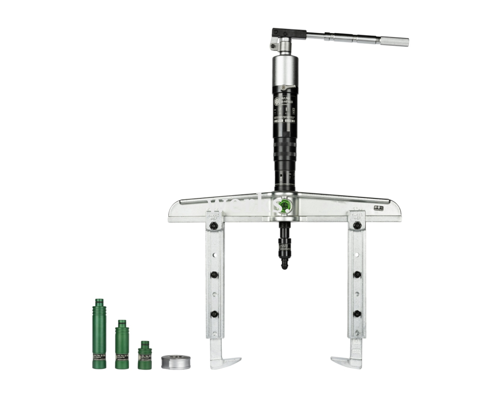 Двухзахватный универсальный съёмник с гидравлическим шпинделем подходит для демонтажа особо тугих подшипников, шестерён и дисков с усилием натяжения до 20 тонн. Благодаря встроенной гидравлической смазке внешний насос не требуется. Выдвижной рычаг может поворачиваться на 360°. Гибкая монтажная резьба на шпинделе позволяет устанавливать различные съёмники KUKKO в зависимости от размера резьбы. Винтовое соединение обеспечивает лёгкое ослабление и особенно надёжную фиксацию съёмных губок шестигранным ключом. Подходит также для эксцентриковых деталей благодаря свободно перемещающимся съёмным губкам, скользящим по траверсе.