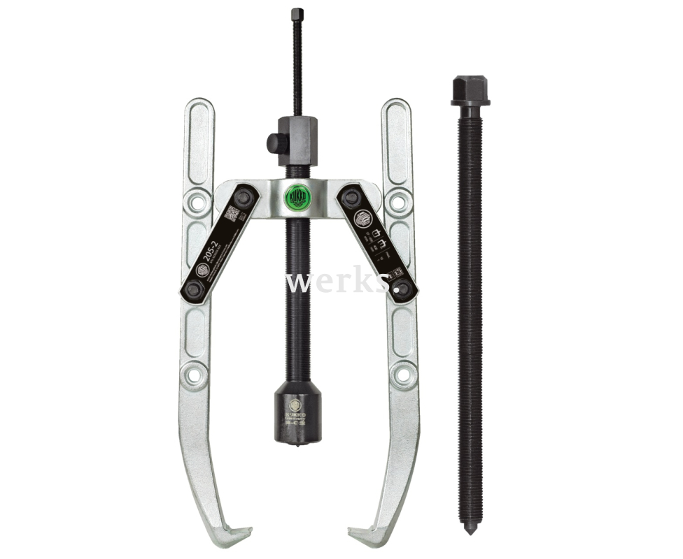 Универсальный двухзахватный съёмник с шарнирными захватами, регулировкой глубины фиксации и длинным гидравлическим шпинделем (включая механический шпиндель) KUKKO 205-02-B