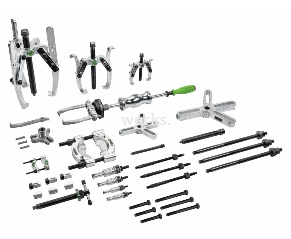 Универсальный набор из 38 съёмников с обратным молотком 224-675 предназначен для центрированного, внутреннего и разделительного демонтажа подшипников, шестерён и дисков всех распространённых размеров в мастерских и на производстве. В комплект входят различные съёмники и сепараторы, обратный молоток, два двухлапчатых и один трёхлапчатый съёмник, а также различные внутренние съёмники с упором. Ассортимент отличается многофункциональностью и подходит для наружного, внутреннего и разделительного демонтажа.