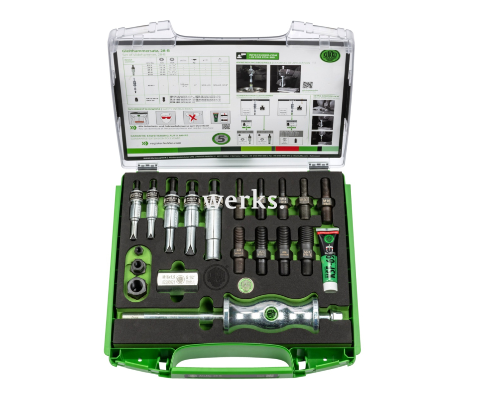 Набор из 19 обратных молотков 28-B предназначен для бесконтактного извлечения внутренних подшипников, наружных колец подшипников и втулок, а также деталей с резьбой (шпонок, ключей, болтов и т.д.) в ремесленных мастерских и промышленности. Многосекционная конструкция внутренних съемников с увеличенными захватными кромками обеспечивает безопасное извлечение внутренних деталей. Входящий в комплект обратный молоток используется вместе с внутренними съемниками. Кроме того, в набор входят резьбовые вставки для извлечения деталей с центральными резьбовыми отверстиями, которые используются вместе с обратным молотком. Универсальная комплектация. Хранение в коробке позволяет легко контролировать комплектность набора.
