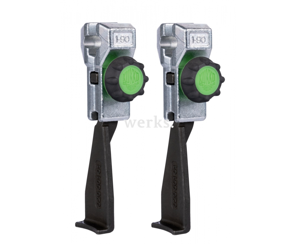 Пара из двух узких быстрорегулируемых съёмных захватов подходит для универсальных двухлапчатых съёмников. Узкие захваты обеспечивают доступ даже к узким и труднодоступным местам. Зелёные рифлёные ручки обеспечивают максимальный комфорт и позволяют быстро и без инструментов ослаблять и затягивать захваты, даже мокрыми или масляными руками. Благодаря свободно перемещающимся по траверсе захватам, можно снимать даже эксцентриковые детали. Насечка обеспечивает быстрое освобождение и перемещение захвата без инструментов.