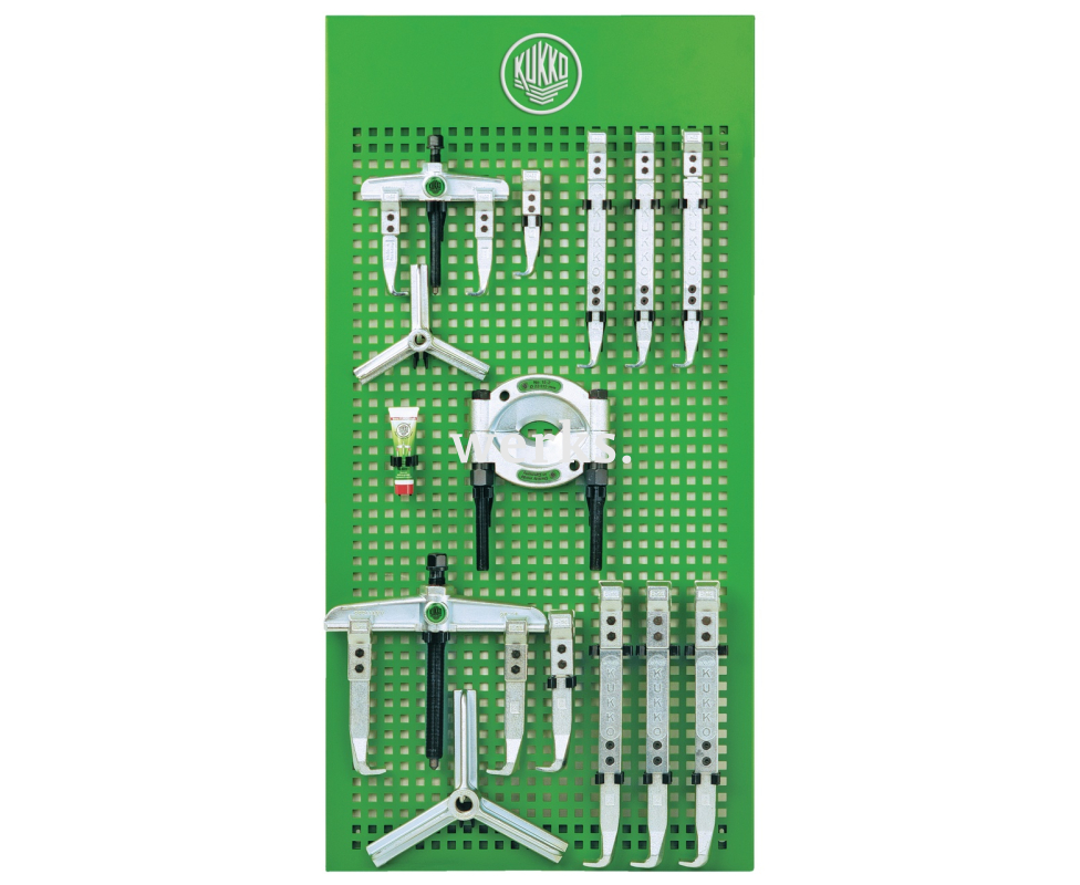Ассортимент съёмников BASIC для промышленности представляет собой настенную панель, оснащённую подходящим инструментом для использования и хранения в мастерских и на производстве. Помимо универсальных съёмников с двумя лапками, ассортимент также включает в себя трёхлапковые траверсы и различные крюки, которые благодаря модульной системе KUKKO можно комбинировать в различные внешние съёмники для различных применений. Вместе с входящим в комплект сепаратором, ассортимент подходит для наружного и внутреннего извлечения, а также для разделения, что делает его идеальным для универсального применения в промышленности. Подборка основана на многолетнем опыте применения в различных отраслях. Доступность продукции для каждого сотрудника.