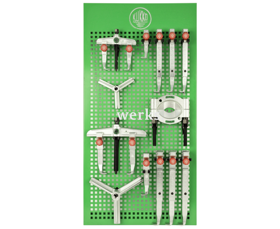 Комплект съёмников BASIC+ для промышленности представляет собой настенную панель, укомплектованную необходимыми инструментами для использования и хранения в мастерских и на производстве. Помимо универсальных съёмников с двумя лапками и быстрой регулировкой захватов, в комплект входят трёхлапковые траверсы и различные крюки, которые благодаря модульной системе KUKKO можно комбинировать в различные внешние съёмники для различных применений. Вместе с входящим в комплект разделительным устройством комплект подходит для внешнего и внутреннего извлечения, а также для разделительного извлечения, что делает его идеальным для универсального использования в промышленности. Составление основано на многолетнем опыте применения в различных отраслях промышленности. Доступность продукции для каждого сотрудника.