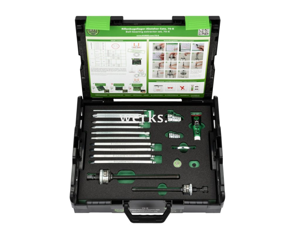 Набор из 37 съёмников для шарикоподшипников 70-K используется для неразрушающего демонтажа шарикоподшипников без демонтажа вала в ремесленных мастерских, на производстве и в мастерских. С помощью этих съёмников подшипники, установленные одновременно в корпусе и на валу, можно легко и быстро снять, а если они ещё не повреждены, использовать повторно. Серия 70 отличается своими съёмными захватами, специально разработанными для точного ввода в дорожки качения подшипников, что позволяет безопасно снимать подшипники как малых, так и больших размеров. Универсальная комплектация. Хранение в коробке позволяет легко контролировать комплектность набора.