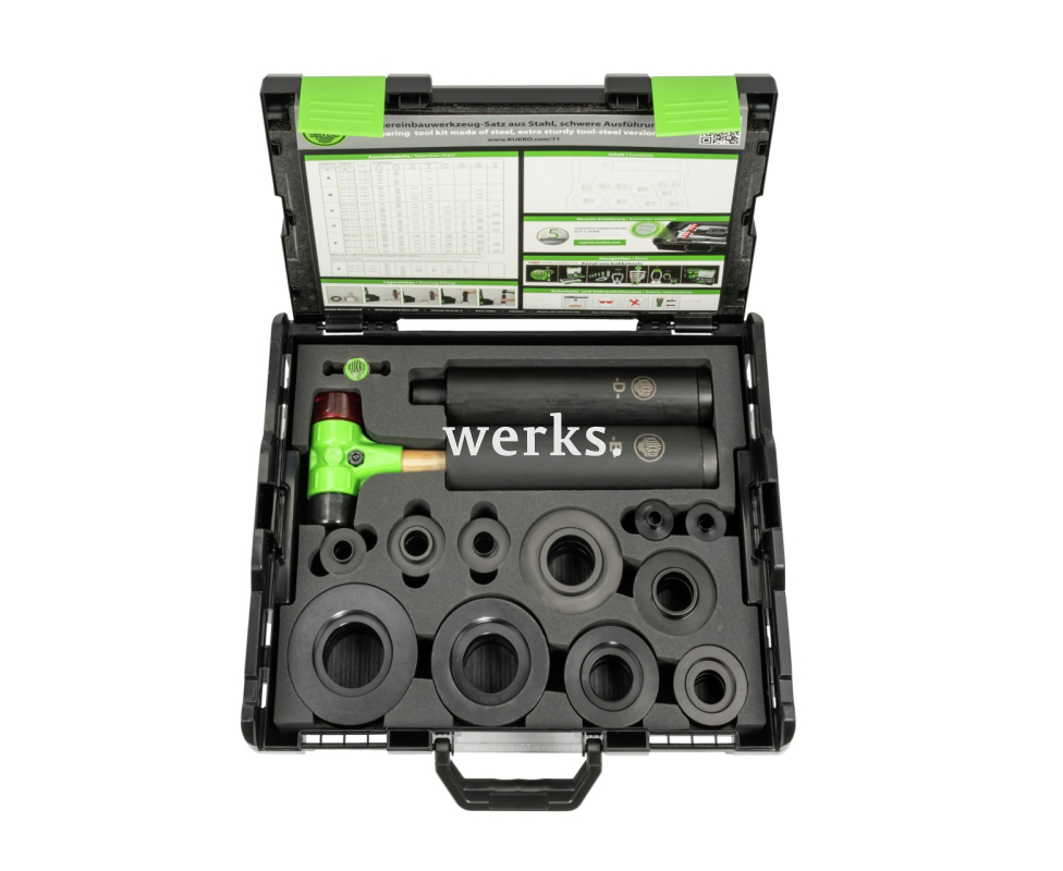 Набор инструментов для установки подшипников из стали серии 71, состоящий из 39 предметов, в прочном исполнении, предназначен для установки подшипников с помощью гидравлического пресса или молота в ремесленных, промышленных и мастерских. В комплект входят 33 ударных кольца и 5 ударных трубок из сверхпрочной стали, а также 1 SELCTHOR с двумя различными ударными вставками (PU/CA). Набор инструментов позволяет производить установку подшипников без повреждения осей, корпусов подшипников и уплотнительных колец. Универсальная комплектация. Хранение в коробке позволяет легко контролировать комплектность набора.