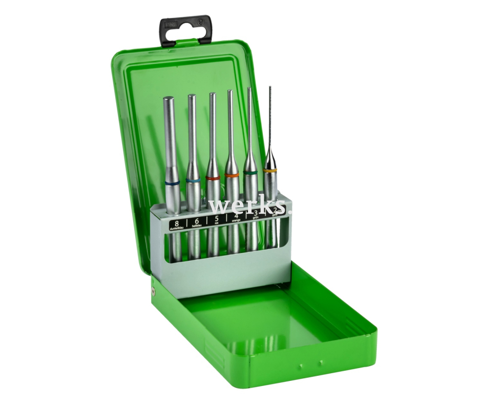 Набор пробойников серии 720 используется для выбивания штифтов и подобных деталей в ремесленном производстве, промышленности и мастерских. В набор входят пробойники шести различных диаметров, что позволяет выбрать оптимальный инструмент в зависимости от области применения. Универсальная комплектация. Благодаря цветовой кодировке пробойники легко различаются.