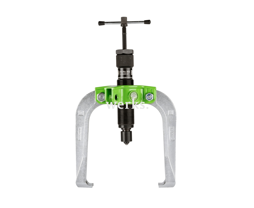 Удобный двухзахватный съёмник с самоцентрирующимися лапками, усиливающими усилие, и гидравлическим шпинделем со смазкой предназначен для демонтажа плотно посаженных подшипников, шестерён и дисков всех распространенных размеров в мастерских и промышленности. При затягивании шпинделя лапки съёмника автоматически центрируются. Гидравлический шпиндель со смазкой серии 800 является движущей силой съёмника и развивает тяговое усилие 10 тонн. Этот мощный инструмент впечатляет компактной конструкцией, простотой применения и удобством транспортировки. Ребра по бокам шпинделя обеспечивают удобный захват для пальцев при перестановке. Самоцентрирование лапок съёмника осуществляется вручную (технология Autogrip). Удлинители шпинделя позволяют быстро адаптироваться к различным требованиям.