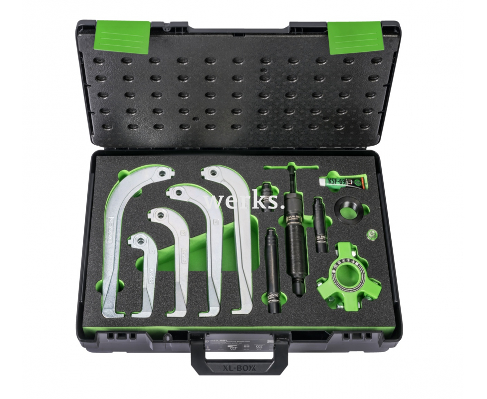 Гидравлический набор из 21 съёмника «10» с самоцентрирующимися захватами предназначен для демонтажа подшипников, шестерён, дисков и т.д. в ремесленном производстве, промышленности и мастерских. В комплект входят съёмники, гидравлический шпиндель, крюки, а также двух- и трёхзахватные комбинированные траверсы, которые можно объединить в десять различных съёмников благодаря легко заменяемым и легко комбинируемым отдельным частям. Универсальная сборка, ориентированная на практическое применение. Хранение в коробке позволяет легко контролировать комплектность набора.
