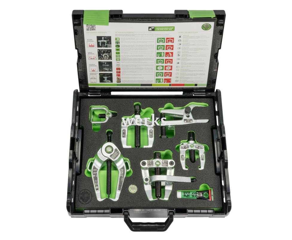 Комплект для обслуживания передней части автомобиля, предназначенный для снятия и обслуживания поворотных рычагов, шаровых шарниров, рулевых тяг и подшипников колес. KUKKO K-127-A/6
