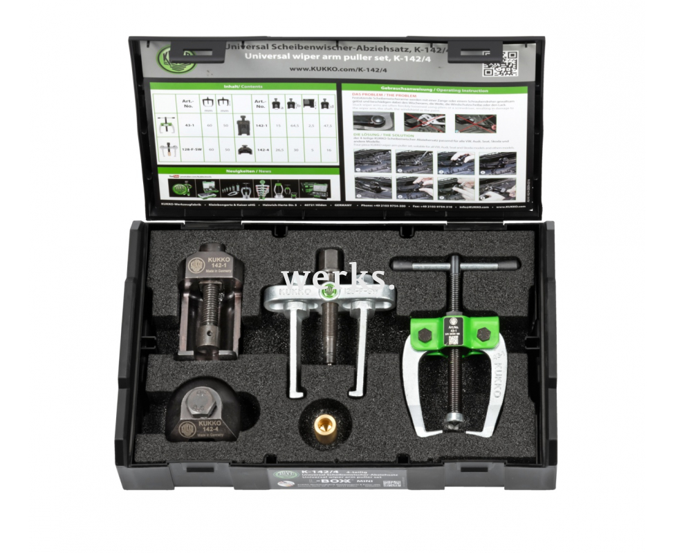 Универсальный набор из 5 съёмников стеклоочистителей K-142/4 предназначен для снятия застрявших, заржавевших и глубоко застрявших поводков стеклоочистителя на всех моделях автомобилей. Помимо съёмников серии 142, в комплект входят съёмник поводков стеклоочистителя серии 128-F-SW, а также универсальный двухлапковый съёмник с самоцентрирующимися захватами серии 43. Благодаря такой комбинации, набор позволяет аккуратно и безопасно снимать детали даже в сложных ситуациях, не разбирая дополнительные детали. Универсальная комплектация, ориентированная на конкретную область применения. Хранение в коробке позволяет легко контролировать комплектацию набора.