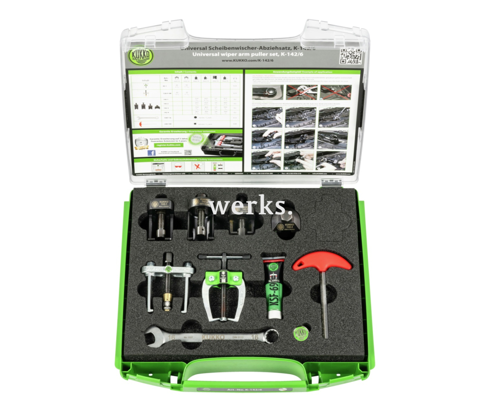 Универсальный набор из 8 съёмников стеклоочистителей K-142/6 предназначен для снятия застрявших, заржавевших и утопленных поводков стеклоочистителя на всех моделях автомобилей. Помимо съёмников серии 142, в комплект входят съёмник поводков стеклоочистителя серии 128-F-SW и универсальный двухлапковый съёмник с самоцентрирующимися захватами серии 43. Благодаря своей конструкции этот набор позволяет аккуратно и безопасно снимать детали в сложных ситуациях, не разбирая другие детали. Универсальная комплектация, ориентированная на конкретную область применения. Хранение в коробке позволяет легко контролировать комплектацию набора.