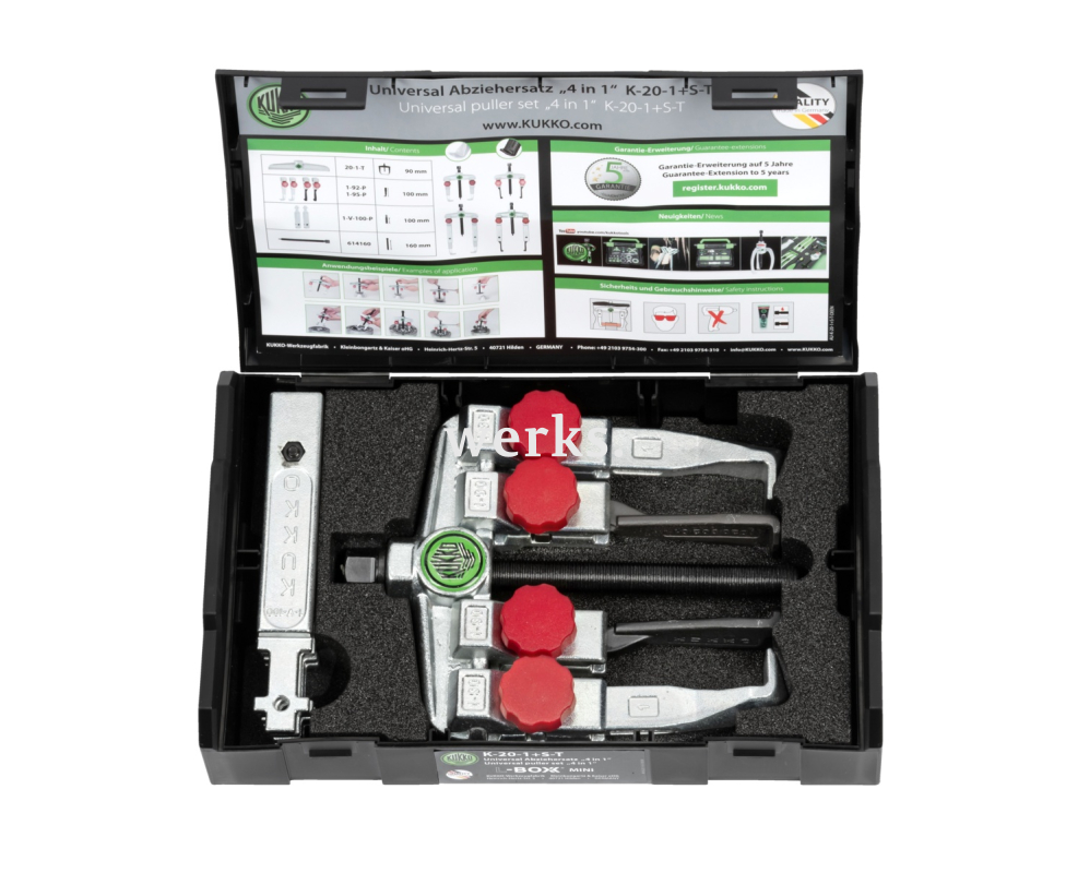Набор из 8 универсальных съёмников с удлинителями предназначен для универсального применения при демонтаже зубчатых колёс, подшипников, звёздочек и корпусов синхронизаторов всех распространенных размеров с помощью двух захватов в мастерских и на промышленных предприятиях. Это позволяет открутить любой компонент, установленный на валу и имеющий свободный доступ снаружи. Универсальный съёмник, оснащённый прочными и регулируемыми стандартными захватами, обеспечивает особенно безопасное и неразрушающее снятие как при внешнем, так и при внутреннем демонтаже. Этот набор позволяет собрать 4 различных модели съёмников благодаря различным комбинациям стандартных и ST захватов и удлинителей, обеспечивая максимальную универсальность применения. Ориентированная на применение сборка для универсального использования. Хранение набора в коробке сохраняет комплектность набора. Винтовое соединение обеспечивает лёгкое отсоединение и особенно надёжное закрепление захватов с помощью шестигранного ключа.