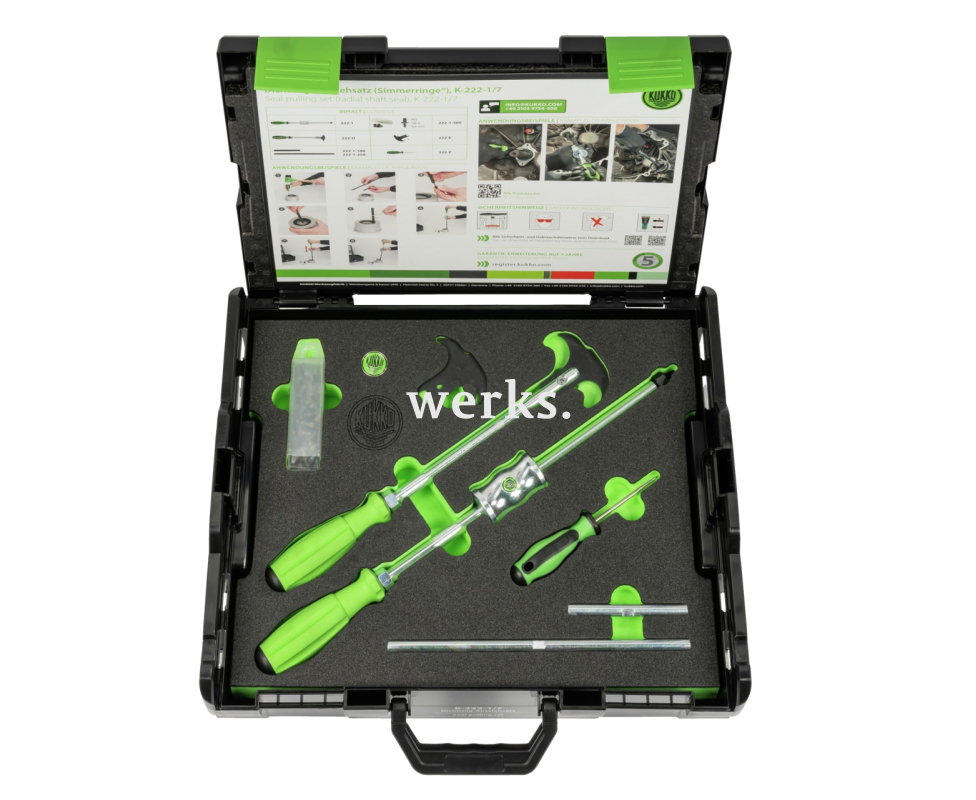 Набор из 7 съёмников уплотнительных колец серии K-222 предназначен для снятия колец Simmerring®, радиальных уплотнений вала, уплотнительных втулок, прокладок, уплотнений подшипников и уплотнений вала в ремесленных мастерских, на производстве и в мастерских. Помимо инструментов для снятия, отмычки и специального набора винтов, в набор также входят различные удлинители и рукоятки для обеспечения оптимальной работы съёмника. Серия K-222 впечатляет своей универсальностью и подходит для использования в различных отраслях и сложных ситуациях. Универсальная комплектация, ориентированная на область применения. Хранение набора в кейсе позволяет легко контролировать его комплектность.