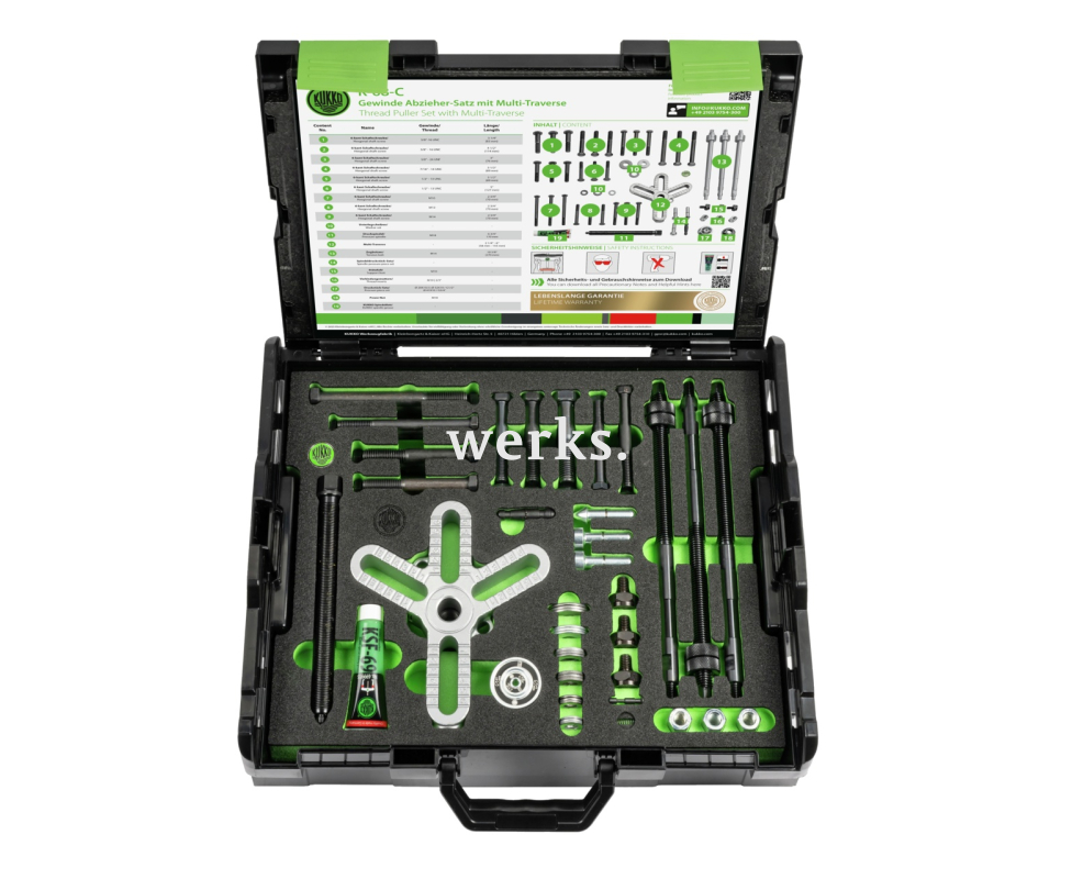 Набор многосторонних съёмников болтов K-68-C предназначен для демонтажа деталей с резьбовыми отверстиями. Съёмник и набор нажимных приспособлений оснащены технологией KUKKO Power Nut, интегрированной в поперечную балку, которая позволяет прилагать усилие, которое в противном случае было бы возможно только с помощью гидравлики. Положение силовой гайки можно мгновенно изменить одним нажатием кнопки. При установке силовой гайки над поперечной балкой достигается увеличенное усилие натяжения. При установке силовой гайки под поперечной балкой сила натяжения увеличивается. Три небольших магнита закреплены на основании поперечной балки для выравнивания и фиксации силовой гайки. Многосторонняя поперечная балка позволяет устанавливать до трёх боковых болтов для ещё более равномерного распределения усилия. Для точной регулировки на поперечной балке расположена шкала с числовыми значениями. Для индивидуальной адаптации съёмника к валу можно использовать различные нажимные приспособления. Набор охватывает широкий диапазон стандартных резьб для адаптации съёмника. Многоповоротная балка серии 68 позволяет производить протягивание за две или три нити в разбираемой детали.