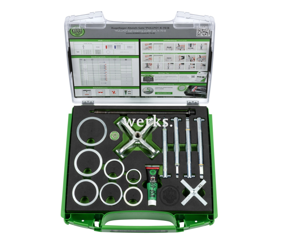Набор из 21 съёмника шарикоподшипников "PULLPO" K-70-B предназначен для полностью безопасного демонтажа радиальных шарикоподшипников без демонтажа вала в мастерских, на производстве и в ремесленных мастерских. Даже без опоры съёмник PULLPO позволяет безопасно демонтаж подшипников, к которым невозможно получить доступ иным способом, обеспечивая повторное использование поврежденных деталей. PULLPO впечатляет не только своей инновационной конструкцией, но и простотой применения: специально разработанные захваты обеспечивают надёжное удержание во время демонтажа и более высокие усилия. В набор, помимо самого PULLPO, входят также подходящие захваты и кольца для правильного использования. Универсальная комплектация, ориентированная на конкретную область применения. Хранение в коробке позволяет легко контролировать комплектацию набора.