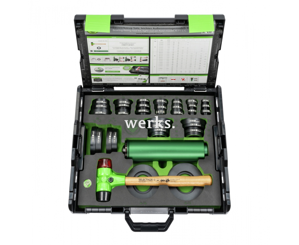 Набор инструментов для установки шарикоподшипников K-71-LC из 38 предметов предназначен для быстрой, точной и безопасной установки подшипников и уплотнений в ремесленных мастерских, на производстве и в мастерских. В набор входят 33 ударных кольца из ударопрочного полиэтилентерефталата, 3 ударные трубки из алюминия, ударная головка и молоток с мягким бойком. Этот набор инструментов обеспечивает безопасную установку подшипников, не повреждая оси, корпуса подшипников и уплотнительные кольца. Универсальная комплектация. Хранение в коробке позволяет легко контролировать комплектность набора.