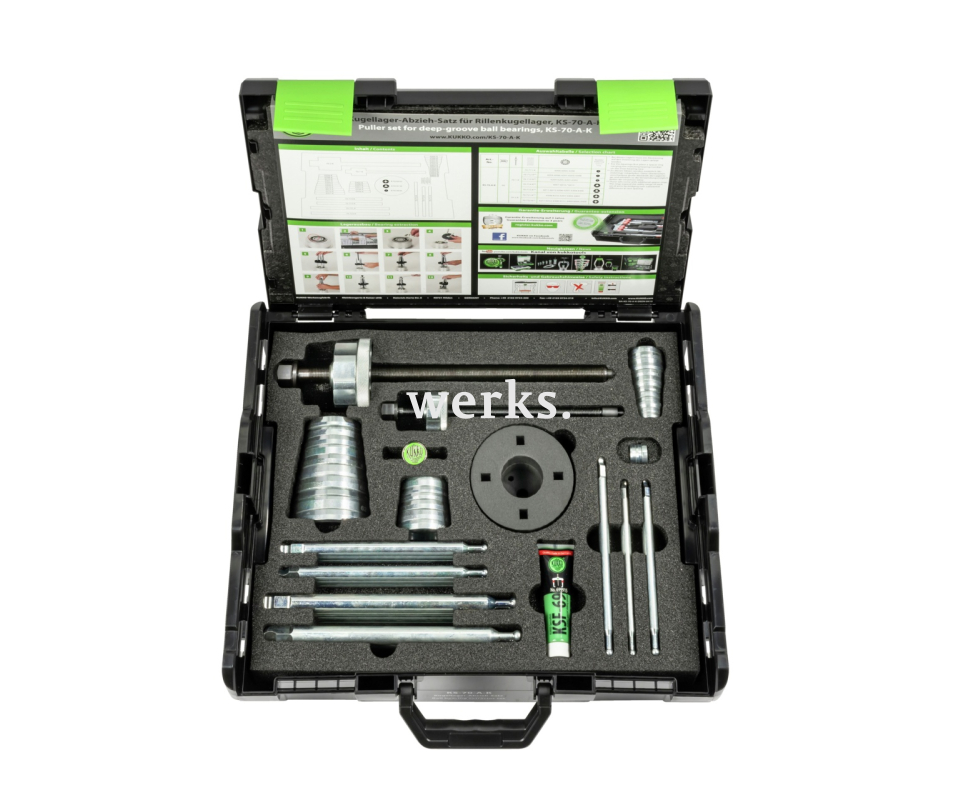 Набор из 60 съёмников для шарикоподшипников KS-70-AK предназначен для неразрушающего демонтажа радиальных шарикоподшипников без демонтажа вала в ремесленных мастерских, на производстве и в мастерских. С помощью этих съёмников подшипники, установленные одновременно в корпусе и на валу, можно легко и быстро демонтажировать, а если они ещё не повреждены, их можно использовать повторно. Серия 70 впечатляет своими съёмными захватами, специально разработанными для точного попадания в дорожки качения подшипников, что, в зависимости от выбранного набора, позволяет безопасно демонтаж подшипников как малых, так и больших размеров. Таким образом, наборы обеспечивают широкий спектр применения с различными диаметрами канавок. Универсальная компоновка, ориентированная на конкретную область применения. Хранение в коробке позволяет легко контролировать комплектность набора.
