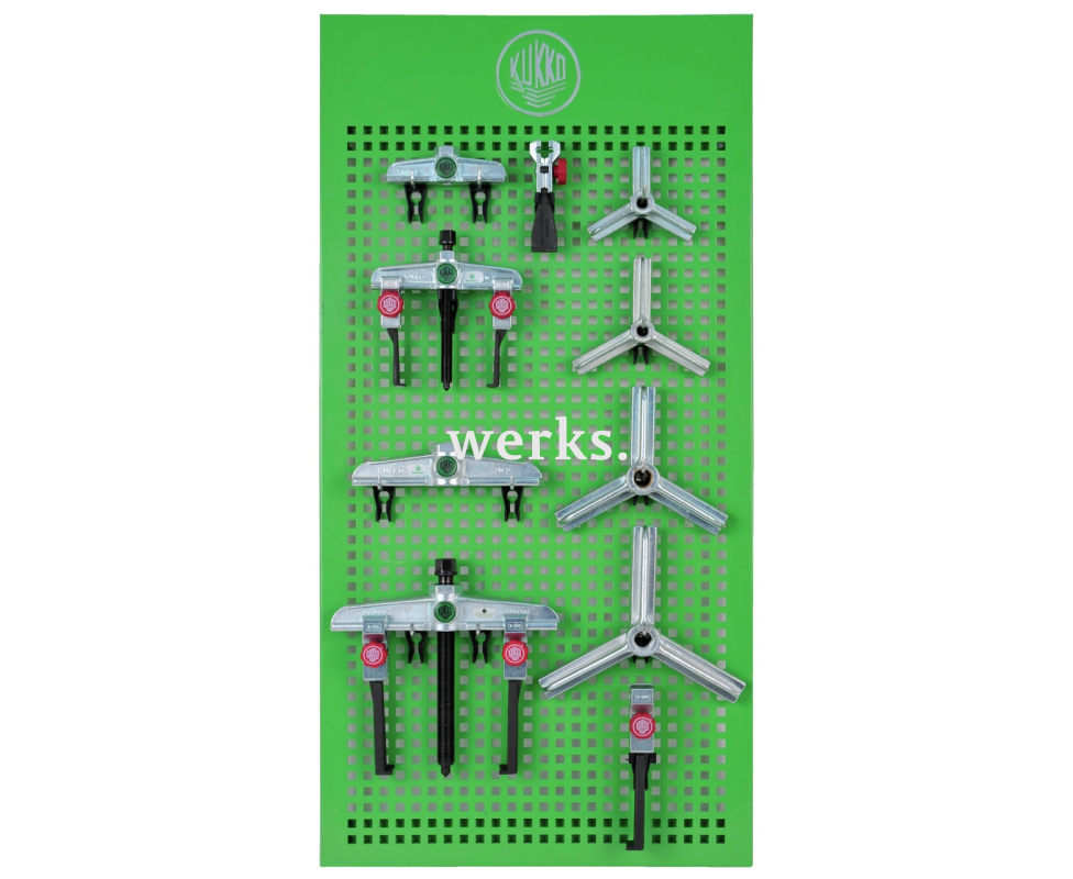 Комплект съёмников BASIC+ для наружного демонтажа представляет собой настенную панель, оснащённую необходимыми инструментами для использования и хранения в мастерских и на производстве. В комплект входят различные двух- и трёхзахватные траверсы и съёмные захваты, которые благодаря модульной системе KUKKO можно комбинировать в различные внешние съёмники для различных применений. Это позволяет снимать любой компонент, установленный на валу и доступный снаружи. Узкие съёмные захваты обеспечивают доступ даже к узким и труднодоступным местам. Составление основано на многолетнем опыте применения в различных отраслях промышленности. Доступность продукции для каждого сотрудника.