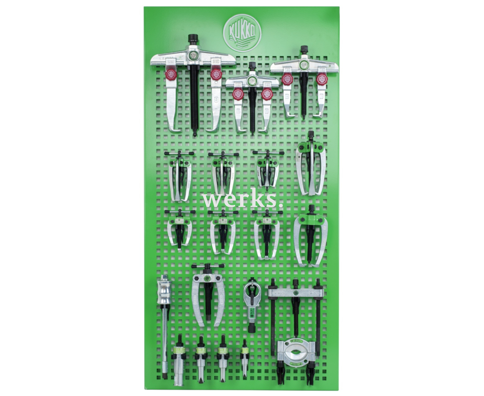 Ассортимент съёмников для промышленности представляет собой настенную панель, оснащённую подходящим инструментом для применения и хранения в мастерских и на производстве. В ассортимент входят различные универсальные съёмники с двумя и тремя лапками, а также внутренние съёмники и соответствующие обратные молотки и контропоры. В сочетании с сепаратором и гайкорезом, набор подходит для наружного и внутреннего съёма, а также для разделения, что делает его идеальным для универсального использования в промышленности. Подборка основана на многолетнем опыте применения в различных отраслях. Доступность продукции для каждого сотрудника.