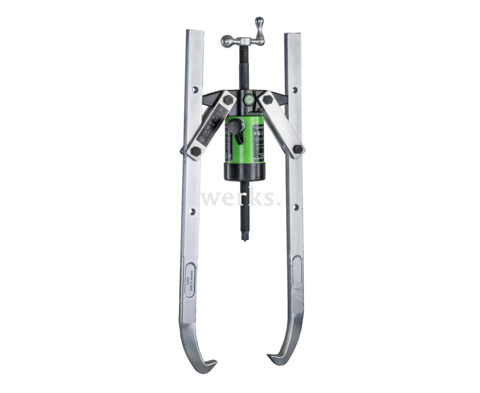 Гидравлический двухзахватный съёмник с регулируемой глубиной захвата и гидравлическим цилиндром с полым поршнем в качестве привода предназначен для демонтажа особо крупных и туго закреплённых подшипников, шестерён и дисков всех распространённых размеров в мастерских и промышленности. Гидравлический цилиндр с полым поршнем развивает высокое тяговое усилие до 50 тонн. Это позволяет снимать любые детали, установленные на валу и доступные снаружи. Осциллирующие лапы съёмника адаптируются к любым монтажным условиям и универсальны благодаря регулируемой глубине захвата. Гидравлический цилиндр с полым поршнем гарантирует лёгкий и контролируемый демонтаж особо крупных и туго закреплённых деталей с минимальными усилиями. Регулируемые лапы съёмника обеспечивают индивидуальную регулировку глубины захвата благодаря нескольким отверстиям в лапах.