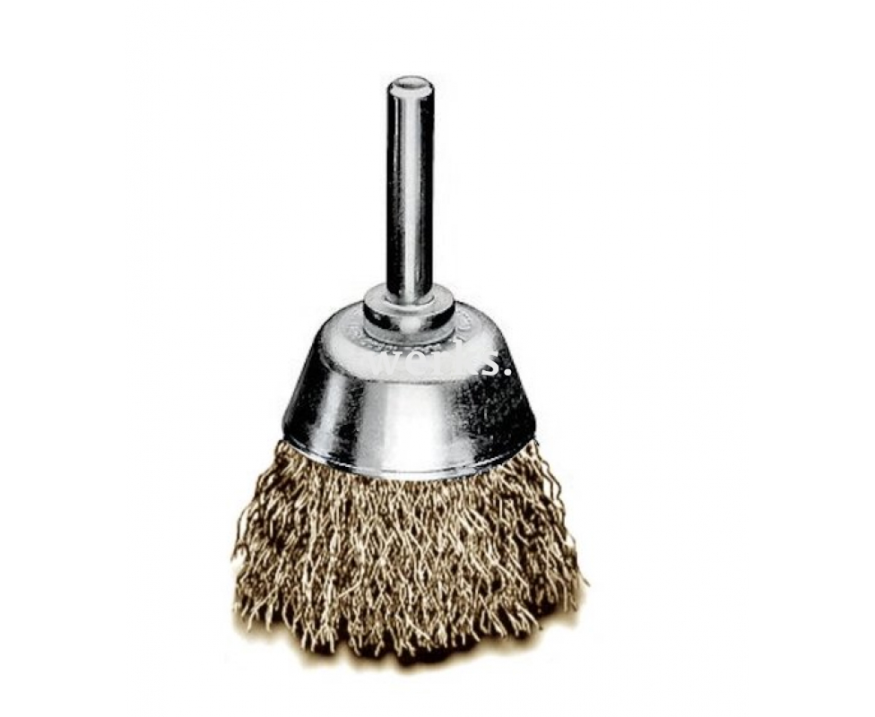 Чашечная щетка с жестко закрепленным хвостовиком. Идеально подходит для использования с ручными инструментами. Максимальная скорость вращения достигает 4 500 об/мин. Проволока из латуни с гофрированной текстурой диаметром 0,25 мм. Длина хвостовика составляет 30 мм, а его диаметр - 6 мм. 430 136