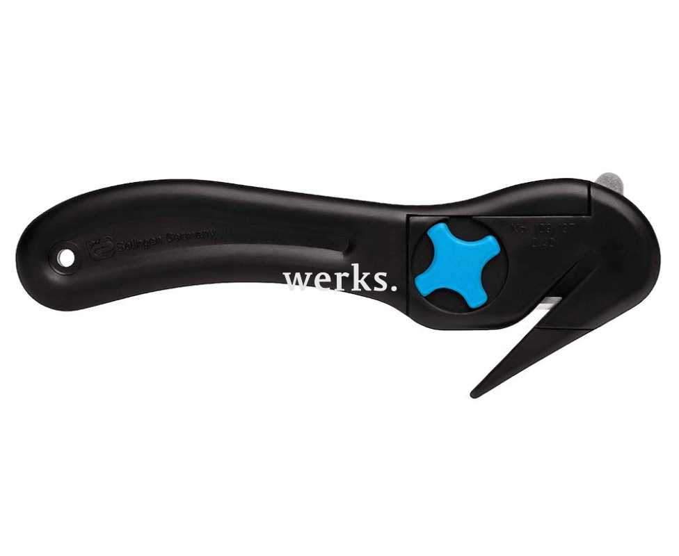 Многофункциональный профессиональный нож с скрытым лезвием и удобной рукояткой. Корпус выполнен из стеклопластика. Длинный закругленный носик направляет инструмент по обрабатываемому материалу, что увеличивает безопасность и точность реза. Скрытое размещение лезвия предотвращает травмы пальцев и повреждения товаров. Лезвие можно быстро заменить без использования дополнительных инструментов. В комплект входит специальная металлическая пластина для надрезания скотча. Глубина реза составляет 3,2 мм. Нож подходит для резки различных пленок, а при установке более толстого лезвия способен разрезать пластиковую обвязку, кожу и ремни. Поставляется в картонной упаковке с запасным лезвием. 109137.02
