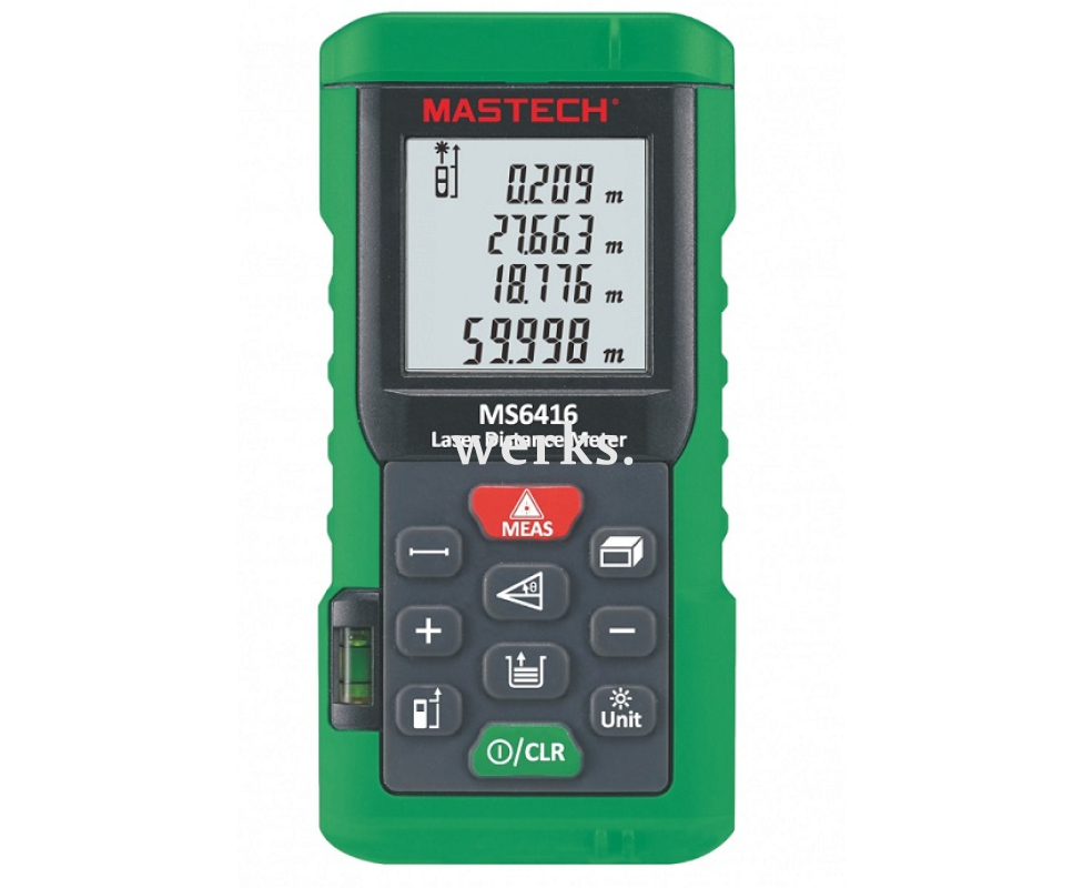 Цифровой лазерный дальномер. Устойчивый пластиковый корпус. Предназначен для точного измерения расстояния до объектов. Четвертое поколение оптической системы. Лазер II класса, 635 нм, менее 1 мВт. Рассчитывает площадь и объем на основе линейных измерений. Обладает высокой точностью измерений. ЖК-дисплей с подсветкой обеспечивает удобство работы в условиях низкой освещенности. Функция сохранения данных. Память на 99 измерений. Возможность определения максимальных и минимальных значений замеров. Индикация разряда батареи. Автоматическое отключение лазера через 20 секунд, дальномера - при бездействии более 150 секунд. Поставляется в компактном кейсе. Диапазон - 0,05~60 м (±1,5 мм) Питание - 3 х 1,5 В батарейки AAA Размеры - 120 x 60 x 28 мм Вес - 175 г. Применяется для точного измерения расстояния до объектов (до 60 м). Идеально подходит для строителей, проектировщиков, лабораторий и промышленных предприятий.