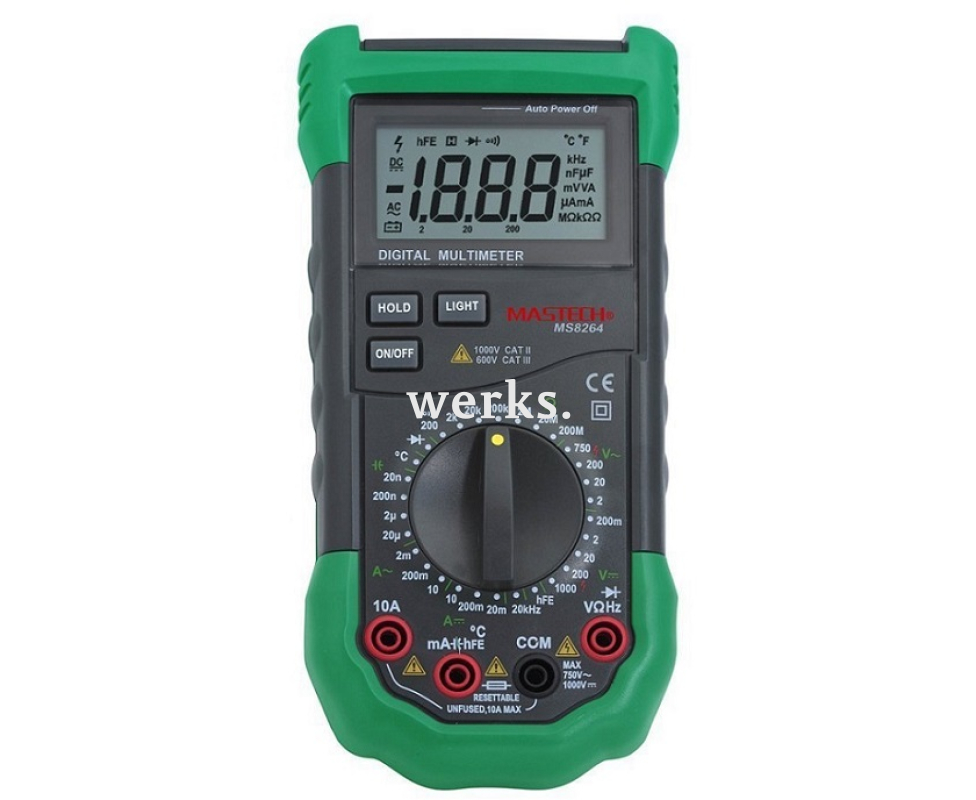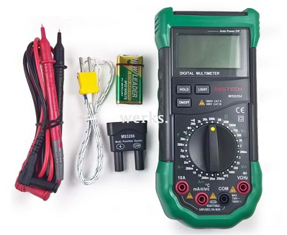 Надежный, безопасный и точный цифровой мультиметр. Обеспечивает измерения силы постоянного и переменного тока, напряжения, сопротивления, электроемкости и частоты с частотой 2-3 раза в секунду. Выполняет прозвон цепи (зуммер с сопротивлением <70 Ω) и удобен для тестирования диодов. Оснащен 3,5-разрядным ЖК-дисплеем с подсветкой и круговой графической шкалой. Имеет функцию удержания данных и ручной выбор диапазона измерений. Оснащен самовосстанавливающимся предохранителем для защиты от перегрузки по току и индикацией разряда батареи. Поставляется в картонной упаковке с измерительными щупами, термопарой типа К, многофункциональным разъемом и батареей. Напряжение постоянного тока - 200 мВ/2/20/200/1000 В (±0.5% ±1) Напряжение переменного тока - 2/20/200/750 В (±0.8% ±3) Сила постоянного тока - 20/200 мА/10 А (±2% ±5) Сила переменного тока - 2/200 мА/10 А (±1.8% ±3) Частота - 20 KHz (±1.5% ±5) Электроемкость - 20/200 нФ/2/20 мкФ (±4.0% ±3) Коэффициент усиления транзисторов по току h21 - до 1000 Электрическое сопротивление - 200 Ω/2/20/200 KΩ/2 МΩ/20 (±1.0% ±3) Тестирование диодов - 3,0 В Температура - -20°С÷0°С (±5.0% ±4); 1°С÷400°С (±1.0% ±3); 401°С÷1000°С (±2%) Питание - 1 х 9 В батарейка типа Крона Защита от перегрузки - CAT II 1000 В/CAT III 600 В Диапазон рабочих температур - 0÷+40°С, влажность <75% Размеры - 195 x 92 x 55 мм Вес - 380 г. Применяется для измерения постоянного и переменного тока, напряжения, сопротивления, частоты, электроемкости и тестирования диодов. Идеально подходит для работы с электротехническим и электронным оборудованием как в лабораторных условиях, так и в домашних.