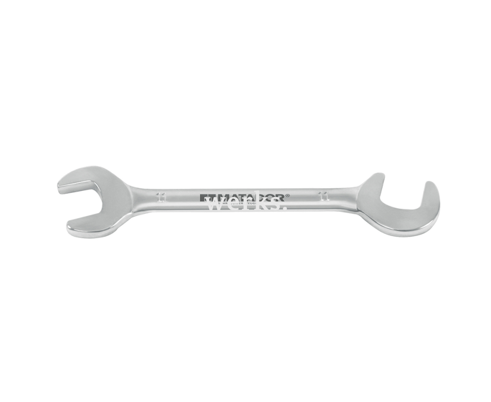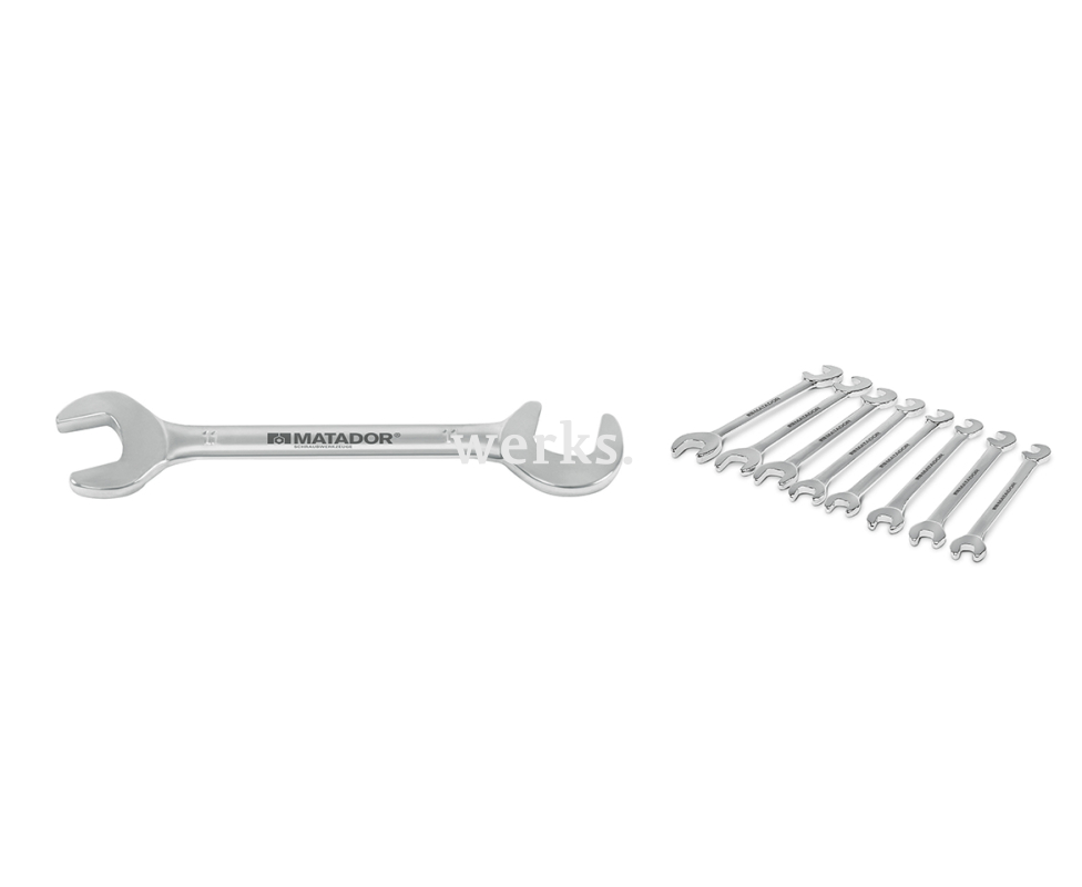 Комплект из 8 двусторонних рожковых гаечных ключей размером от 5 до 11 мм Matador 01459080. Изготовлены из хром-ванадиевой стали. Гладкая хромированная поверхность защищает от коррозии. Зевы имеют наклон 15° и 82,5° с небольшой толщиной, что делает их идеальными для работы в стесненных условиях.