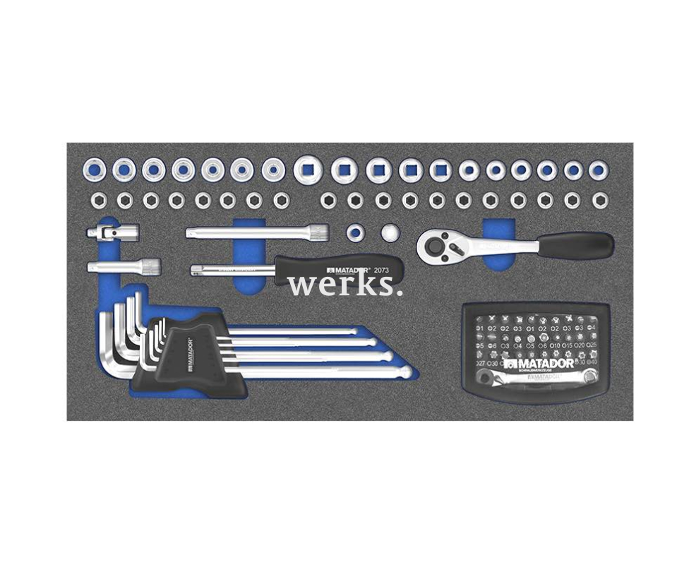В комплект входят: - трещотка 1/4' длиной 125 мм, - удлинитель 1/4' длиной 100 мм, - отвертка-держатель 1/4' длиной 150 мм, - карданный шарнир 1/4', - адаптер для бит 1/4', - переходник с квадрата 3/8' на шестигранник 1/4', - набор из 9 Г-образных ключей НЕХ со сферической головкой, - 11 торцевых головок НЕХ, - 6 торцевых головок TORX, - 3 шлицевые головки 32 мм, - 3 крестовые головки Phillips 32 мм, - 3 головки НЕХ 32 мм, - 8 головок TORX 32 мм, - 30 бит длиной 25 мм (SL, PH, PZ, HEX, TORX, TORX BO). Ложемент совместим с тележками Matador RATIO и VARIO, а также с QUADRO.