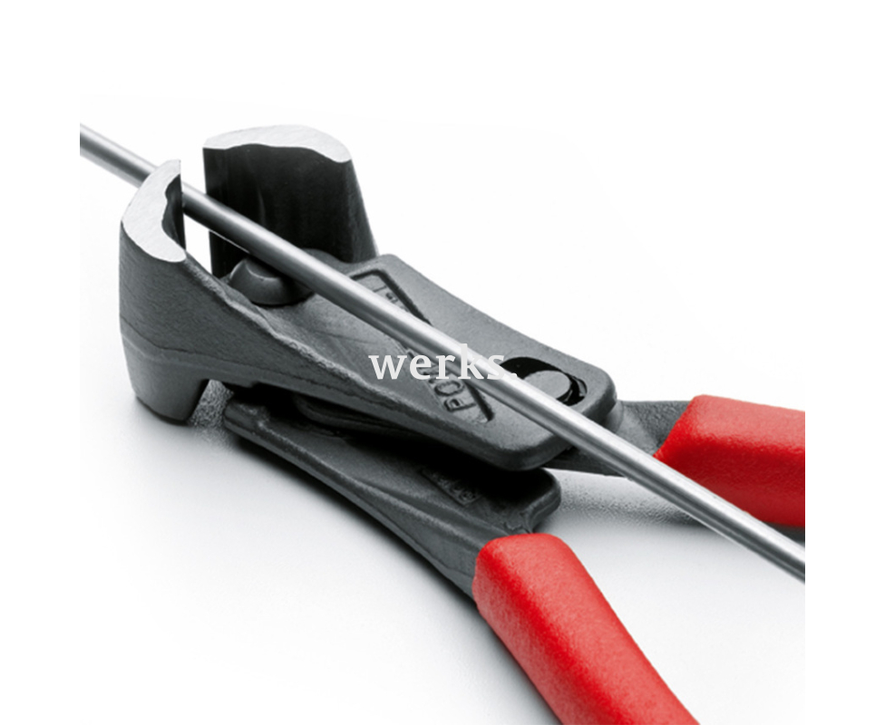 Силовые рычажные клещи длиной 200 мм и весом 345 г. Изготовлены из высококачественной кованой инструментальной стали, закаленной в масле. Прецизионные лезвия с индуктивно закаленными режущими кромками твердостью HRC 61 ~ 63 предназначены для резки болтов, гвоздей, заклепок и жесткой проволоки. Ассиметричное лезвие облегчает процесс резки длинных заготовок. Укрепленная конструкция с оптимизированной рычажной передачей позволяет снизить усилия до 50% по сравнению с традиционными торцевыми клещами. Ручки покрыты пластиком для удобства использования. 1311-12-200