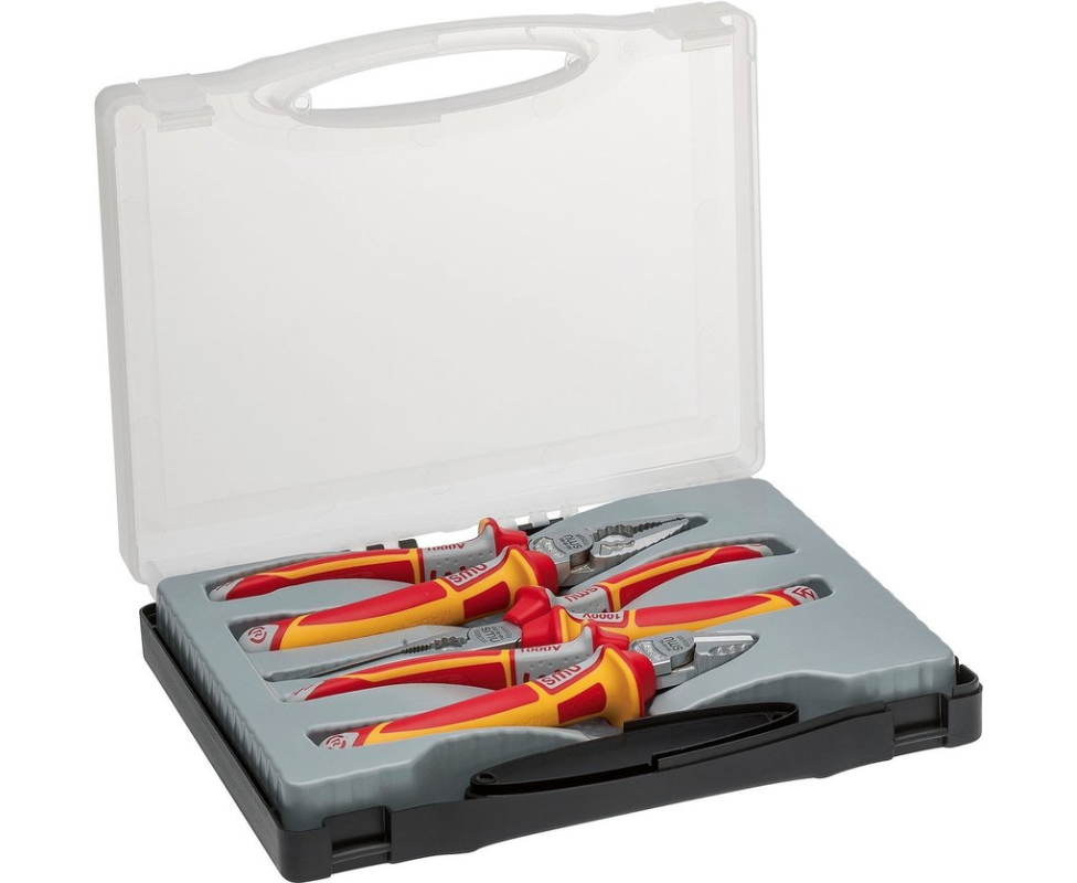 В комплект входят высококачественные пассатижи, кусачки и длинногубцы. Все инструменты сертифицированы по стандартам VDE и безопасны для использования с оборудованием и компонентами под напряжением до 1000 В переменного тока. Поставляется в удобном кейсе Sortimo L-BOXX Mini, изготовленном из прочного ABS-пластика и оснащенном ручкой для удобной транспортировки. Общий вес набора составляет 945 г.
