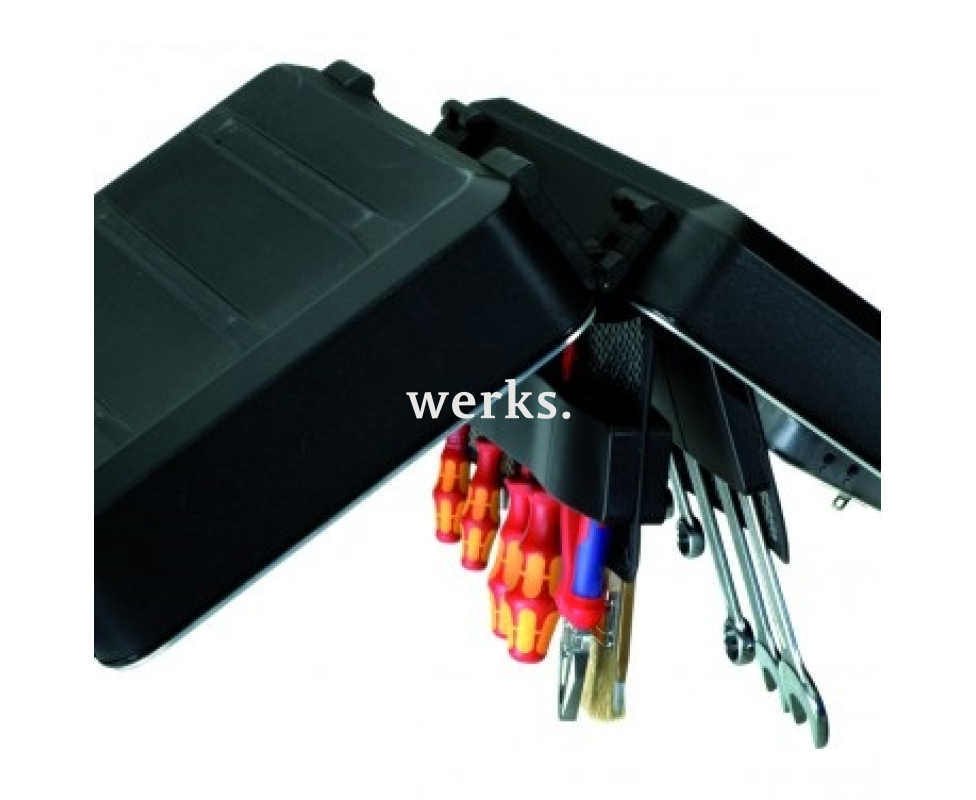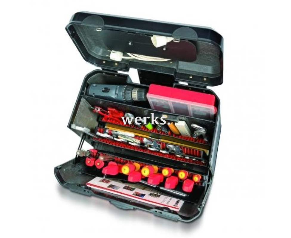Чемодан для инструментов в черно-серебристом исполнении выполнен из прочного ударостойкого пластика X-ABS, дополненного стекловолокном. Его объем составляет 45 литров, что обеспечивает значительное пространство для хранения. Передняя стенка имеет полуоткидной механизм. Этот инструментальный чемодан отличается функциональностью: помимо несъемной перегородки, он включает 2 съемные панели, а внутри располагаются держатели для инструмента СР-7 (2хØ26, 1хØ15 и 2хØ11 мм), а также отделения для документов и визиток. За перегородкой находится большое отделение размером 450 x 93/70 x 385 мм. Удобные колесики обеспечивают легкость перемещения, а замки гарантируют надежное хранение инструментов.