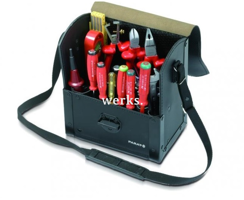 Сумка для инструментов черного цвета выполнена из натуральной толстой выделанной тисненой кожи и полипропилена. Её объем составляет 8 литров. На передней и задней стенках, а также перегородке расположены 17 карманов для удобного хранения инструментов. Перегородка разделяет внутреннее пространство на два отсека и дополнена прозрачным карманом на крышке. Устойчивая к износу кожа значительно продлевает срок службы изделия. Алюминиевые уголки по краям обеспечивают дополнительную прочность. Встроенные упоры защищают дно сумки. Надежный замок-защелка Parat гарантирует безопасность. Регулируемый по длине наплечный ремень можно при необходимости отсоединить, а ручка для переноски обеспечивает удобный захват.