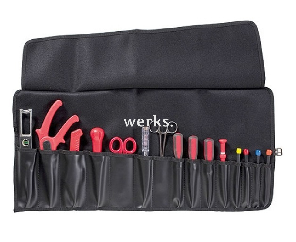 Сумка для инструментов черного цвета, которая сворачивается в компактный рулон, выполнена из прочного и устойчивого к износу кожзаменителя. Она оснащена 15 карманами для инструментов. Эта сумка удобна для транспортировки инструментов и их хранения, например, на стене в мастерской, где ее можно подвесить.