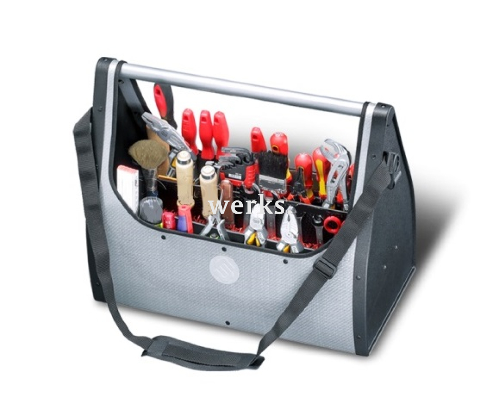 Сумка для инструментов в серебристо-черном исполнении, выполненная из высококачественной синтетической ткани на основе волокон. На передней панели расположены 7 карманов, а на задней — 13, что обеспечивает удобное размещение инструментов. В комплект входят два держателя инструмента CP-7 (Ø11 и Ø26 мм). По периметру сумки находятся ребра жесткости из ABS-пластика. Алюминиевая ручка позволяет удобно переносить и подвешивать сумку. Эта прочная, легкая и устойчивая к износу сумка идеально подойдет как для профессионалов, так и для домашних мастеров. Также предусмотрен прочный наплечный ремень, длина которого регулируется.