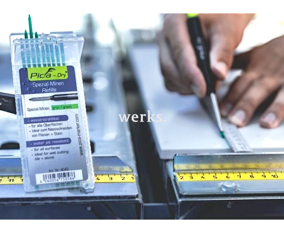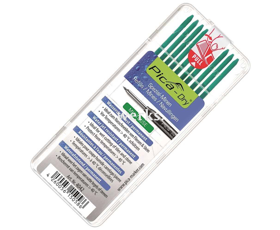 В набор входят 10 водоотталкивающих сменных зеленых грифелей длиной 125 мм и диаметром 2,8 мм. Они идеально подходят для мокрой резки керамической плитки, керамогранита и камня. Также могут использоваться на сухих поверхностях из металла, пластика, дерева и других материалов. Не рекомендуется нагревать выше 40° С. Грифели совместимы с карандашом Pica-Dry 3030 и поставляются в пластиковом футляре.