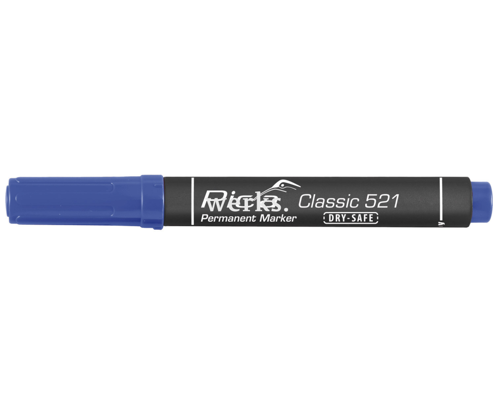 Синий водоотталкивающий перманентный маркер с скошенным наконечником, подходит для нанесения на разнообразные поверхности. Ширина линии достигает 4 мм, а время высыхания составляет 10 секунд. При этом маркер без крышки может оставаться влажным до 14 дней.