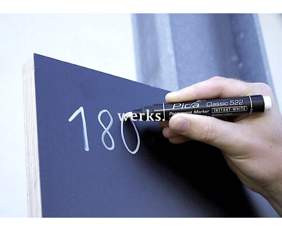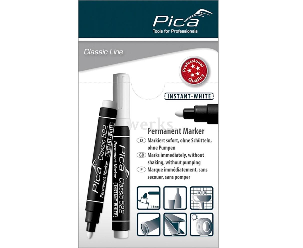 Водостойкий перманентный маркер с круглым белым наконечником и чернилами на водной основе. Корпус выполнен из прочного полипропилена. Ширина линии составляет 1-4 мм. Полное высыхание маркировки происходит примерно за 20 секунд. Инструмент готов к использованию сразу, без необходимости встряхивания или подкачки. Маркировка надежно держится на таких материалах, как сухая резина, металл, пластик, стекло, керамика и ламинированная древесина.