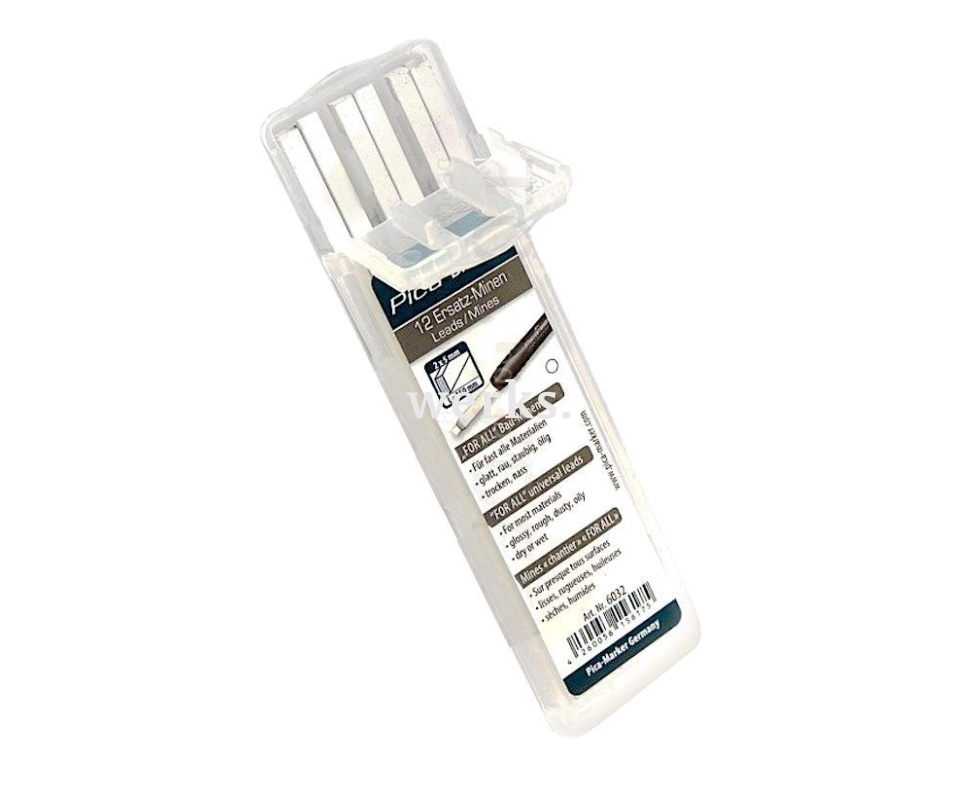 В набор входят 12 сменных графитовых стержней с твердостью 2В и длиной 150 мм, имеющих прямоугольный профиль 2х5 мм. Они предназначены для нанесения маркировки на кирпич, камень, бетон, пластик, металл, древесину и плитку. Следы от маркировки легко удаляются с гладких поверхностей с помощью влажной салфетки. Стержни совместимы с карандашом Pica BIG Dry 6060 и поставляются в пластиковом футляре.