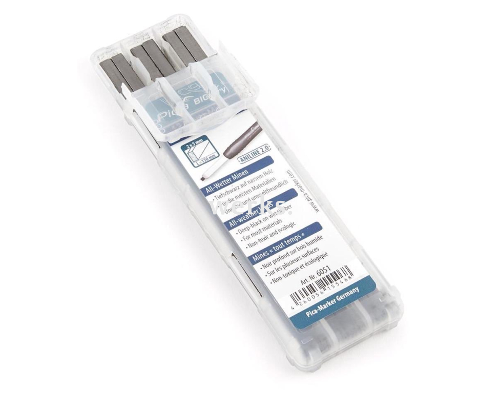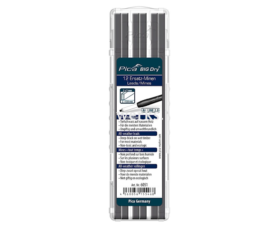 В набор входят 12 универсальных графитовых стержней длиной 150 мм с размерами 2х5 мм. Они изготовлены из прочного модифицированного серого графита, разработанного компанией Pica. Эти стержни подходят для маркировки различных материалов и особенно эффективны на влажных поверхностях, обеспечивая глубокую черную маркировку, в частности, на сырой древесине. Благодаря повышенной влагостойкости, они идеально подходят для использования на открытом воздухе. Стержни совместимы с карандашом Pica BIG Dry 6060 и поставляются в удобном пластиковом пенале.