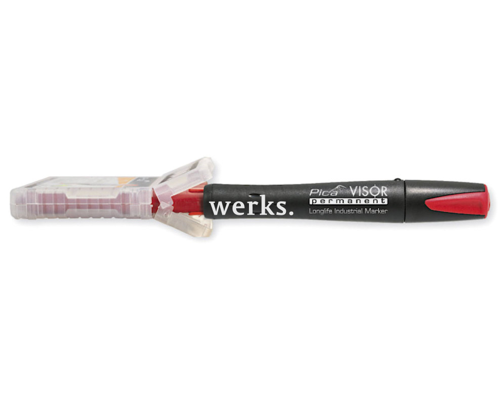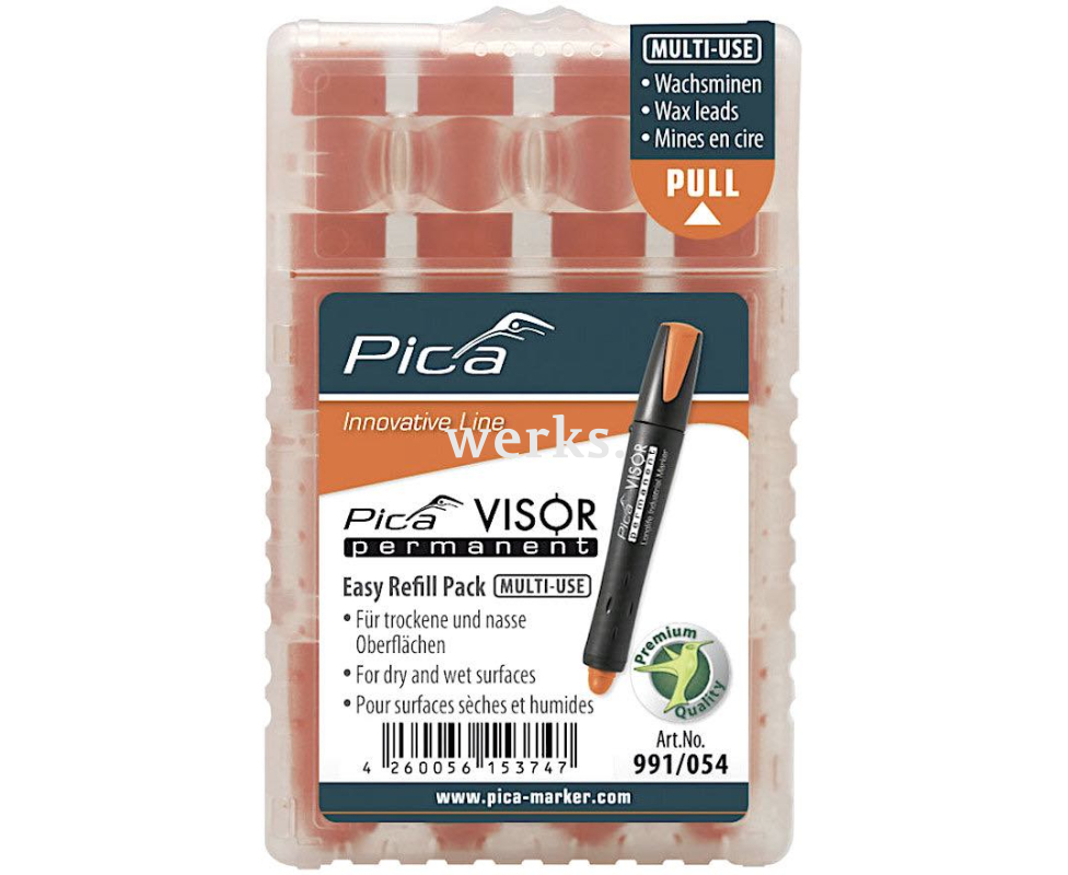 Универсальные оранжевые люминесцентные восковые стержни предназначены для создания водостойкой маркировки на различных поверхностях: сухих и влажных, гладких и шероховатых, загрязненных и масляных, светлых и темных. Диаметр стержня составляет 10 мм, а длина - 85 мм. Эти стержни не подвержены пересыханию. Они подходят для разметки на любых материалах, включая дерево и ламинат, стекло и плитку, пластик и металл, резину и кожу, а также офисные доски. Не рекомендуется нагревать выше 40° С. Применяются в маркерах Pica-Visor.