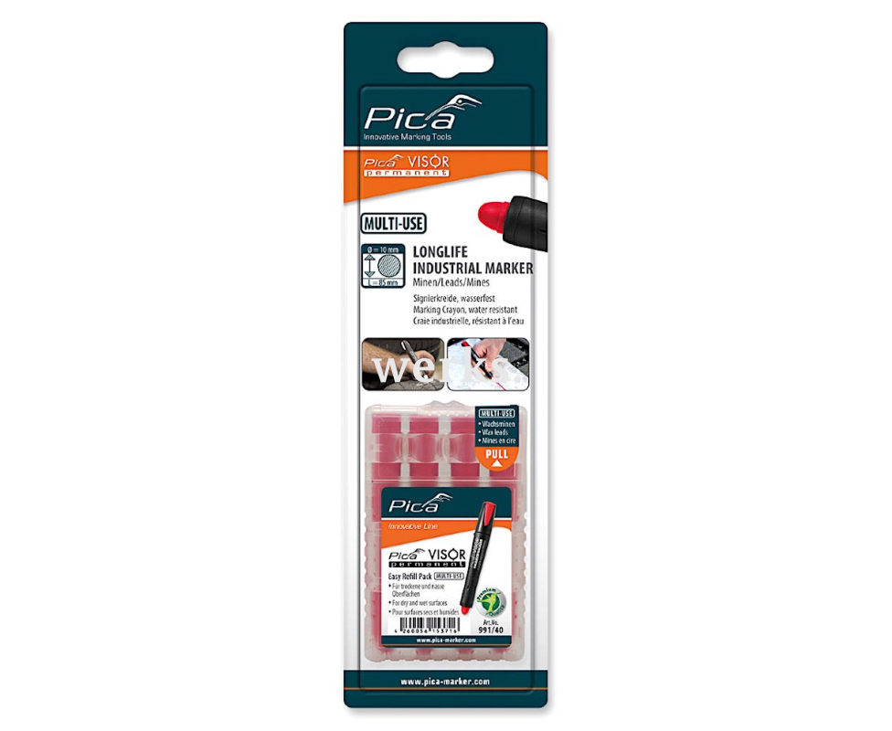 Универсальные красные восковые стержни предназначены для создания водостойкой маркировки на различных поверхностях: сухих и влажных, гладких и шероховатых, загрязненных и масляных, светлых и темных. Размер стержня составляет 10 мм в диаметре и 85 мм в длину. Эти стержни не теряют своих свойств со временем. Они подходят для разметки на таких материалах, как дерево и ламинат, стекло и плитка, пластик и металл, резина и кожа, а также на офисных досках. Не рекомендуется нагревать выше 40° С. Применяются в маркерах Pica-Visor.