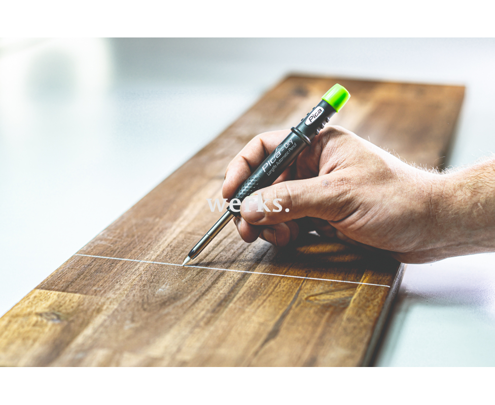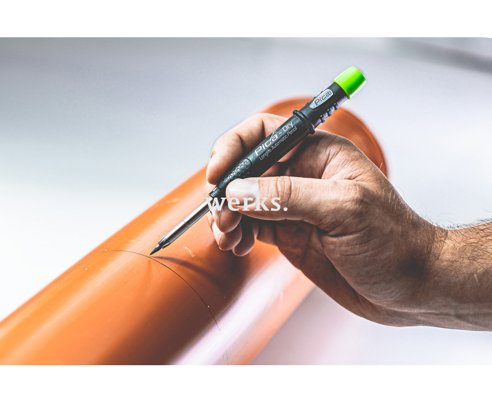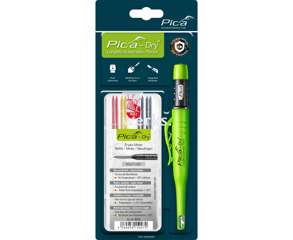 Набор карандаша Pica-Dry (3030) и восьми цветных грифелей Pica (4020) 30402 предназначен для разметки на различных материалах, таких как металл, пластик, дерево, плитка, камень и резина, как на сухих, так и на влажных, глянцевых и матовых, а также на пыльных и масляных поверхностях. Для удаления следов с глянцевых поверхностей достаточно использовать влажную салфетку. Продукт упакован в блистер. В комплект входят грифели: 4 графитовых, 2 красных и 2 жёлтых.